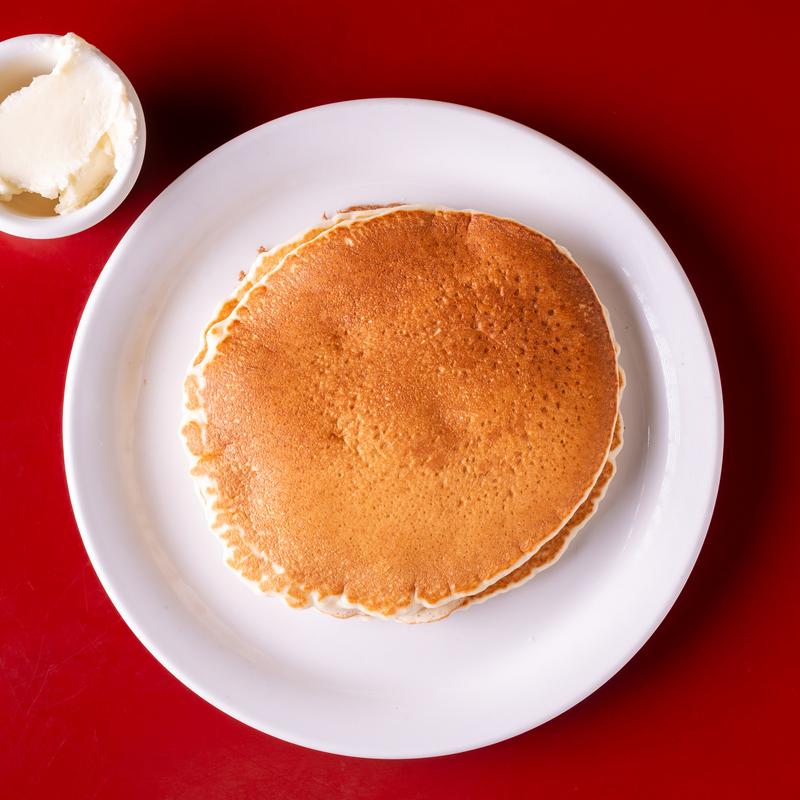 2 buckwheat or buttermilk pancakes with butter and maple syrup. Served with two strips of bacon or sausage links & 2 eggs.