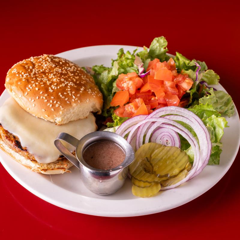 8 oz. of freshly ground chuck, spiced by us, served on a toasted onion bun, with mayonnaise, lettuce, tomato, red onions, pickle & served with french fries.