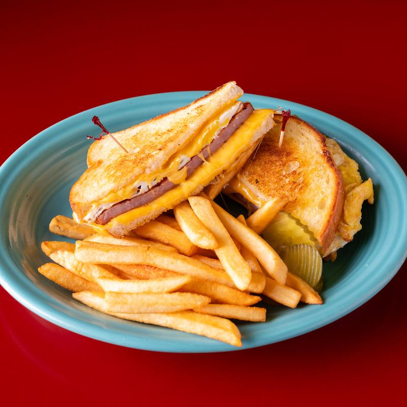 The basic with Swiss cheese, green onions, on grilled rye with 1000 Island & served with french fries.